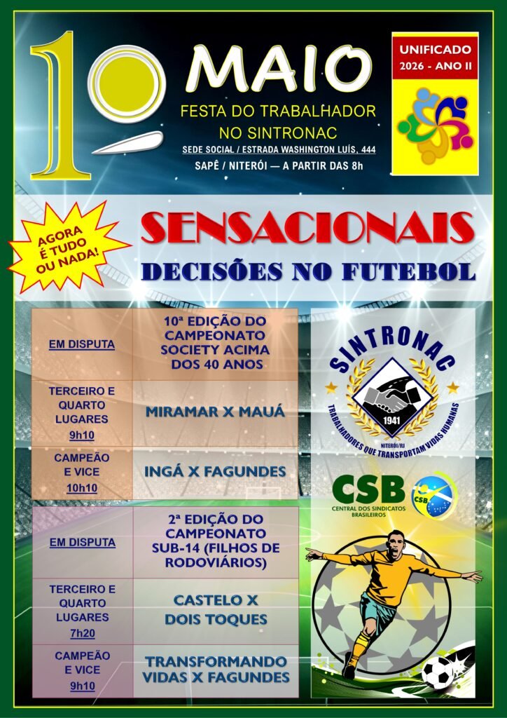 O Sindicato dos Rodoviários de Niterói a Arraial do Cabo (Sintronac) recebe, neste 1º de Maio, pelo segundo ano consecutivo, as celebrações do Dia do Trabalhador Unificado, reunindo, a partir das 8h, diversas categorias profissionais do Leste Fluminense em sua sede social, no bairro do Sapê, Niterói, com o apoio da Prefeitura de Niterói.