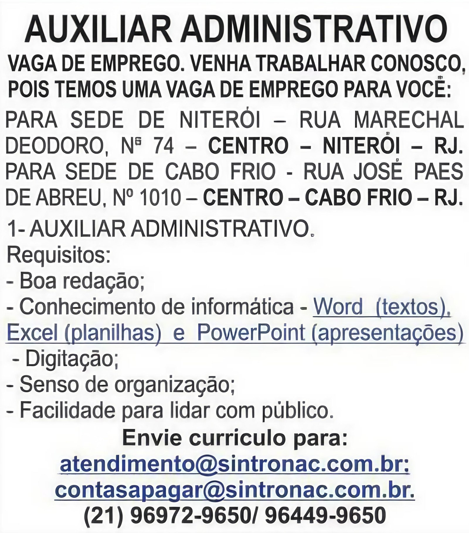 Sintronac abre vagas para auxiliar administrativo em Niterói e Cabo Frio