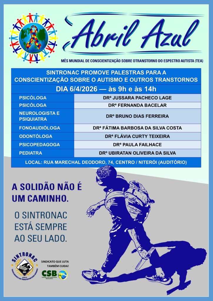O Sindicato dos Rodoviários de Niterói a Arraial do Cabo (Sintronac) promove, na segunda-feira (6/4), uma série de palestras sobre o Transtorno do Espectro Autista (TEA), envolvendo especialistas em sete áreas de Saúde, responsáveis pelo atendimento a autistas no Departamento Médico da entidade. Nos três primeiros meses deste ano, o setor registrou 263 casos. O Sintronac implantou o serviço em 2024, direcionado a filhos de rodoviários.